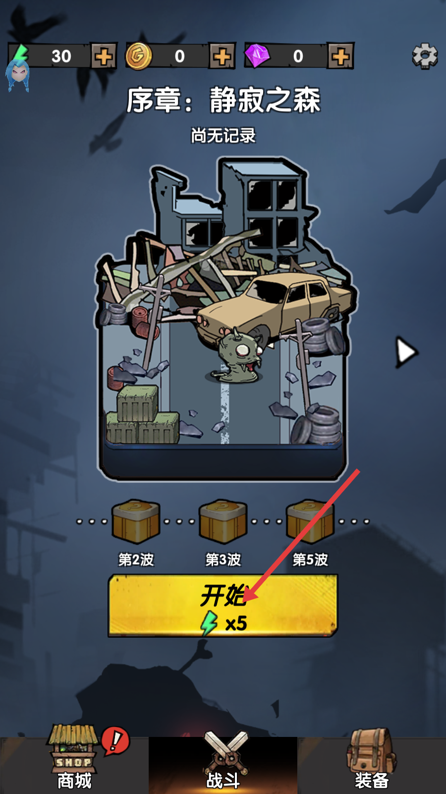 1、点击【开始-x5】进入序章【静寂之森】,消耗资源启动游戏后,就能逐步挑战后续的波数关卡。