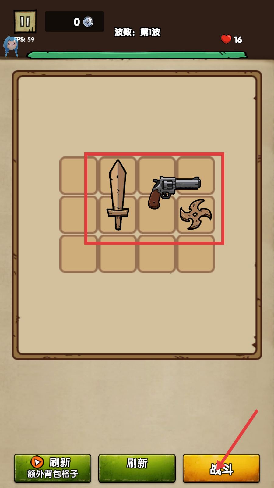 2、挑选【剑】【手枪】【手里剑】这类武器,点击【战斗】按钮开启第一波战斗,提前为战斗备好装备。
