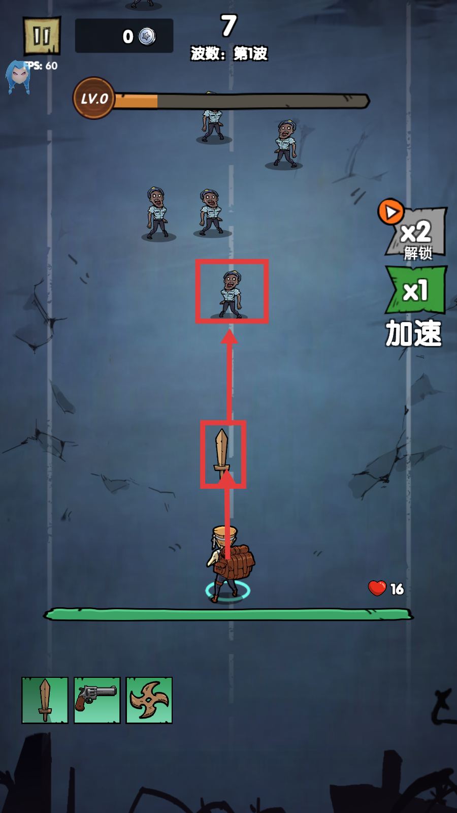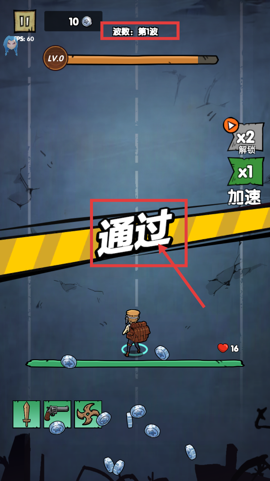 3、战斗时用【剑】对敌人发起攻击,留意【波数-第1波】以及等级进度,一步步消灭敌人来推进进程。