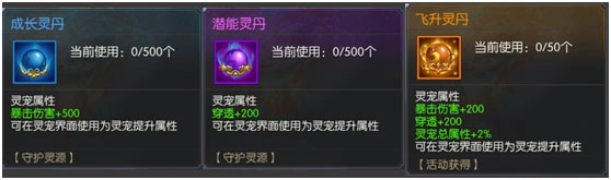可以用成长灵丹、潜能灵丹和飞升灵丹来提升灵宠的属性,这三种灵丹的使用上限依次是500、500和50。