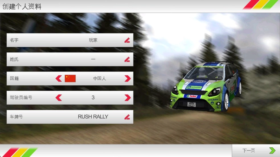 1、启动拉力竞速3游戏,创建角色,创建完成后,点击下一页;