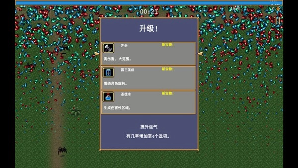 5、击败敌人后会掉落蓝色宝石,拾取该宝石可获得一定经验值;当经验条累积满时,角色等级将得到提升,同时能从三个随机出现的宝物中挑选一个。