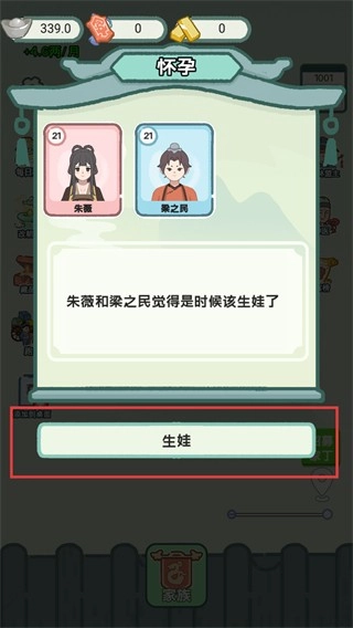 4、在【怀孕】剧情界面点击【生娃】按钮,推进角色生育剧情,拓展家族成员。