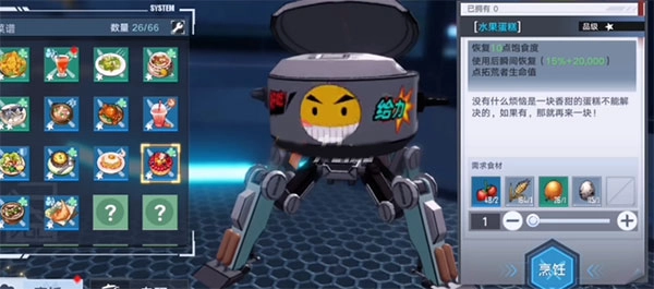 接下来要做的是前往烹饪锅那里点击操作进行烹饪,但这里有个需要留意的地方——妮可给出的信息其实并不完整,因为从水果派的食谱里能发现,制作它还得用到西红柿,等把这四种食材都凑齐了,就可以着手制作了。