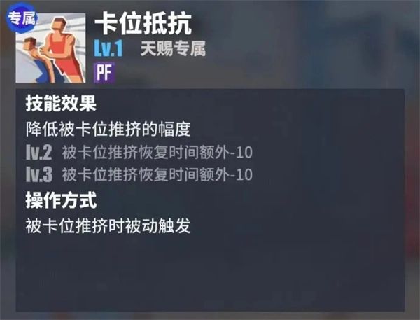 PF的基础技能之一。借助补篮不仅可以抢到部分原本或许抢不到的篮板球,还能快速发起进攻并得分。天赐的被动技能能减轻对手卡位带来的干扰,让他在篮下对抗时更占优势,特别是争抢篮板的激烈场景中表现更稳定。该技能升级后,被卡位推挤时的恢复效率会进一步提升,二级和三级阶段都能额外缩短恢复所需的时间,同时还能降低被推挤的幅度,帮助他在密集对抗中保持更好的站位。
