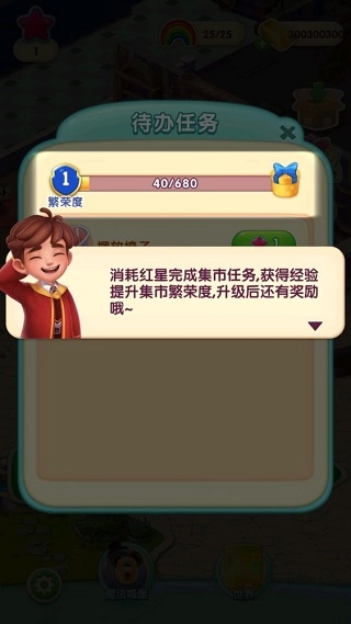 挑战成功后,点击“任务”按钮,在这个页面你能看到待办任务,完成这些任务就能获得经验;另外,收集红星后可以消耗红星来完成集市任务,不仅能获取经验,还能提升集市繁荣度,升级后更有丰厚奖励等着哦~