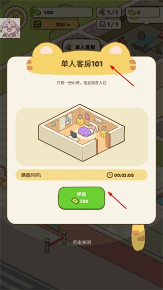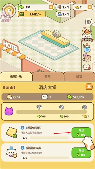 客人离店后获取收益,持续升级设施与建造新客房,朝着打造繁华猫咪酒店的目标努力。
