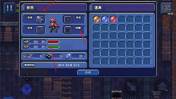 进入状态界面后,可查看角色的攻击、防御等属性,以及生命值、能量值等状态信息。
