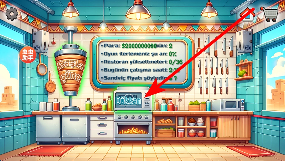 进入游戏后,首先点击带有Gir标识的餐厅入口,开启你的经营之旅。随后在厨房界面找到Dükkan相关区域,在这里可以查看初始资金、经营天数等基础信息,为后续的经营活动做好准备。