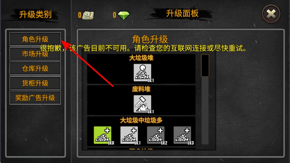 进行角色与设施升级,进入升级面板,选择角色升级等类别,提升大垃圾堆、废料堆等设施的等级。
