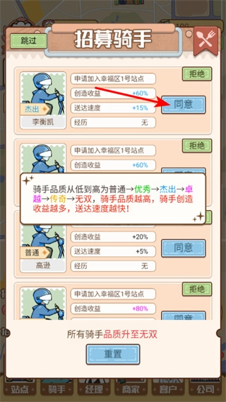 我们正在招募优质骑手,您可以进入招募骑手界面,挑选具备杰出品质的骑手,点击同意招募按钮即可完成操作。这一举措有助于提升配送速度和收益创造能力,从而保障高效的配送服务。