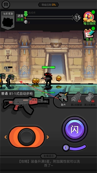 点击左侧橙色按钮来操控角色,使用普通的81-1式自动步枪攻击敌人,以此积攒闪技能的能量。