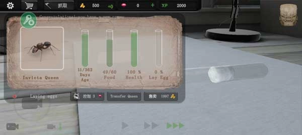 开始后,先把试管放置在桌面上进行筑巢,以此获取蚁后和工蚁。