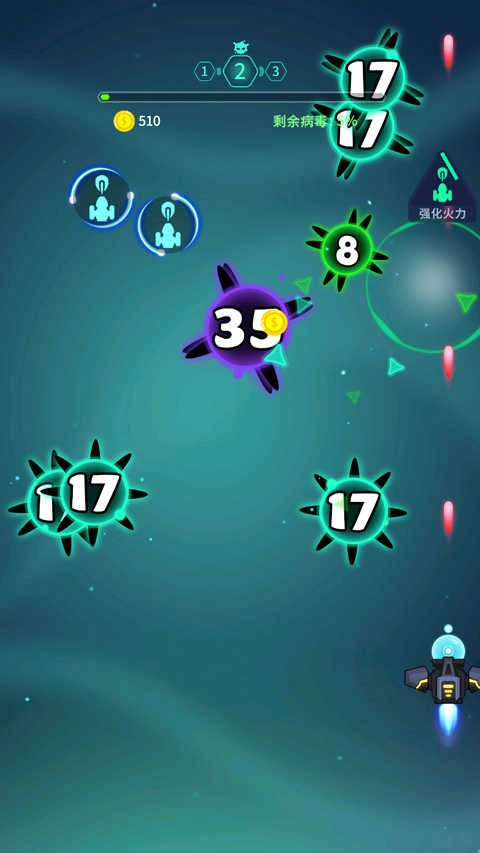 3.完成设置后,点击屏幕即可开启游戏。玩家需要操控飞行器进行射击,通过滑动屏幕的方式消灭病毒。