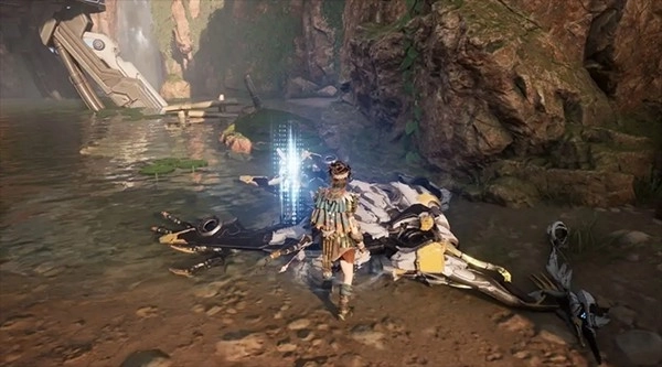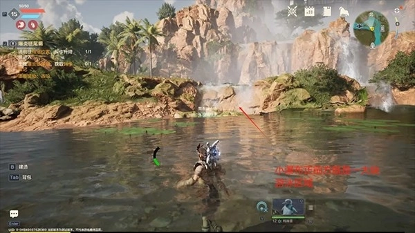 来到钓鱼点后,往水中逆着水流向上走,就能看到一处瀑布。瀑布所在的整片区域都是深水区,拓荒者们可以在这里尽情畅游。