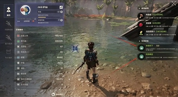 2、当左上角人物状态区域的下方出现红色图标时,意味着角色处于负状态,这类状态会造成角色部分数值下降。以最常见的“饥肠辘辘”为例,它的成因是角色长时间未进食、处于饥饿状态,会导致角色的耐力恢复速度变慢、伤害输出降低,此时需要通过进食来缓解。另外,在河里游泳会触发浸水状态,从水中上岸或被雨淋则会进入潮湿状态;夜晚身边没有篝火时会出现寒冷状态,长时间淋雨还可能引发风寒疾病——这些负状态都会导致角色数值下降,所以出现后务必及时处理改善。