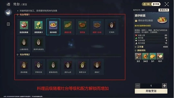 当角色使用三种不同食材后,即可获得“吃饱喝足”的增益状态,此时生命与耐力的恢复速度以及伤害都会有所提升。而食用经过烹饪的料理,能够让进食带来的增益状态维持更久的时间,并且不同品级的料理,其增益效果的持续时长也存在差异。