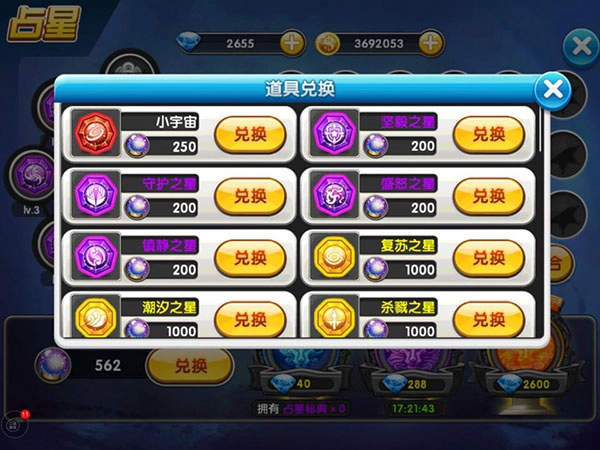 4、星座兑换:可用积分兑换小宇宙经验星座,以及部分紫色与黄色星座,多用于补充属性百分比加成型星座。