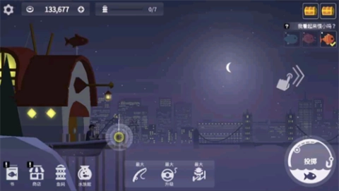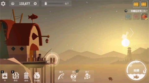 2. 挑选好自己喜欢的垂钓位置,点击“投掷”图标,果断地把鱼钩甩进水里。