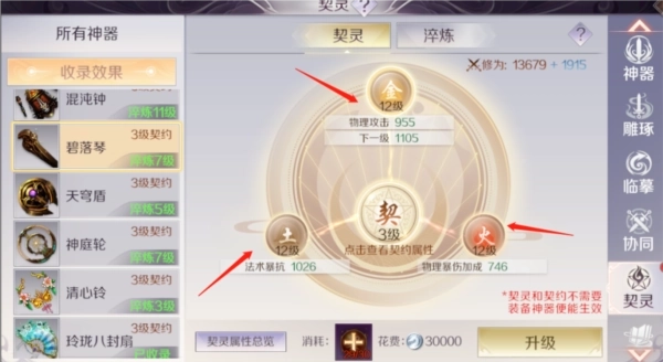 对已收录的神器可以进行契灵提升该类型神器的属性,契灵共有五种,分别为金木水火土,每个神器拥有不同数量和种类的契灵属性。平民玩家将契灵点到10级(触发2级契约)或12级(触发3级契约)即可,收益是最大的。
