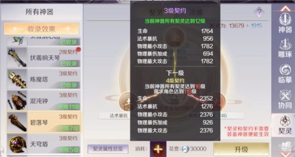 该神器的全部契灵属性达到特定等级时契约等级会提升,提供更多的契约属性。2级契约等级所带来的属性性价比是非常高的,如果3级契约等级所需契灵等级是12级,那么可以将其提升至3级,如果3级契约等级所需契灵等级是15级,那么可以暂时先将其搁置在2级,等资源足够的时候在提升至三级。