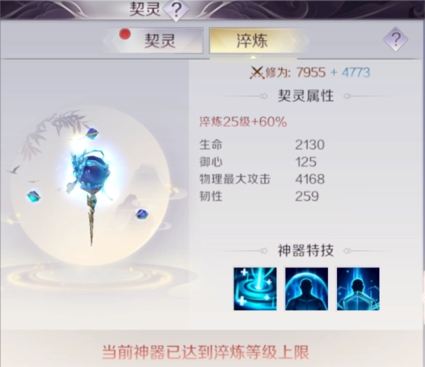 通过消耗该神器的碎片进行淬炼,每次淬炼都会百分比提升该神器的契灵与契约属性值(当前版本最高可以提升60%的属性加成),如果先进行淬炼再提升契灵等级,后提升的契灵等级依然享受淬炼的百分比加成,淬炼至特定等级时,可以提高神器特技等级上限(最高6级,原先是5级)。