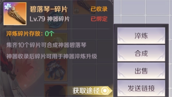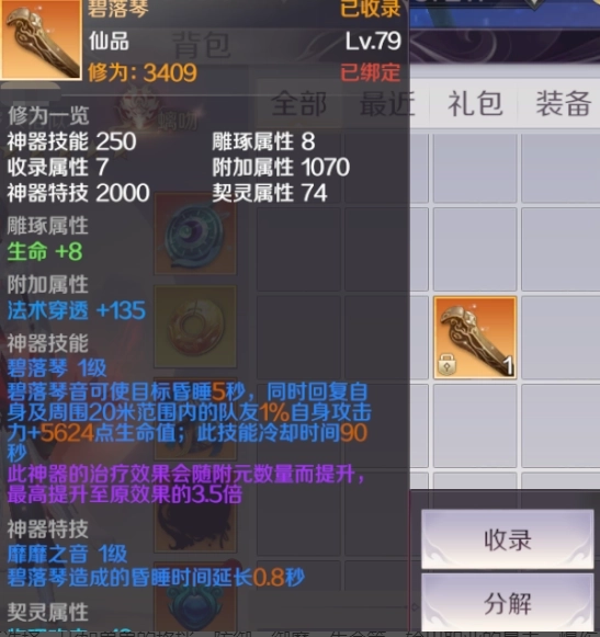 小技巧:当前版本由于有神器淬炼系统的加入,我们可以通过将高品质神器的通过分解,合成的步骤不断的刷新自己所需的属性值,所获得的属性值也是最高的。平民玩家的具体方法为将背包中获得神器碧落琴(获取简单,频繁且属性值高,有条件的玩家可以用其他属性值更高的神器)进行分解