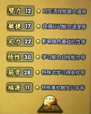 1.关于初始属性,悟性是核心(悟性每提升两点,每点学点对应的熟练度增幅就增加一点),建议选择28点悟性及以上,其余属性则以自身想要学习的绝学需求为主要依据(例如若想学习龙象,那么臂力、筋骨和福缘这些属性就必须刷到较高数值)。