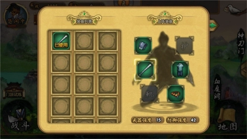 3.技能掌握好后,先把山洞遇敌、江湖地图遇敌的次数消耗几次,再把练功房的精力消耗一部分(注意别让次数和精力溢出),接下来就可以刷装备了。第一个目标是10两银子进入的林中道地图,去刷加悟性的装备——这比较看运气,武器最高能加3点悟性,其他部件各加1点。尽量把悟性装刷满,要是时间紧张,刷到三件以上也可以,后期再补刷。之后去京城找书生学读书技能,学到20级(记得先刷装备再学读书),这样悟性大概能到38以上。接下来就可以消耗学点了,把所有能加学点的地方都刷一遍;如果轻功已经到30,优先点外功,再点内功——前期外功的加成比内功高。