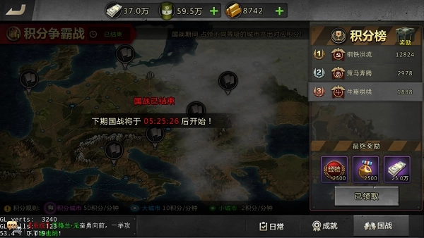 开启城战之后,每天能参与两次国战,时间分别是中午12点30分和晚上20点30分,每次国战持续1小时,参与就能获取丰厚经验;要是花些时间去争夺排名,获得的经验还会翻倍呢!