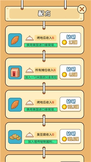 4、美食配方同样需要我们用心钻研与升级,通过钻研升级配方能够提升摊位的收入。