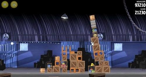 本关会开启新的黄色小鸟。这种小鸟虽然极其神速,但碰到石壁和玻璃墙时的攻击力仍然有限。用这种小鸟进攻木头壁垒简直像捅破一层纸一样好用,这样你就可以闪电袭击敌人,让它们葬身于堡垒的废墟之中。而且在发射之后你还可以按一次鼠标左键进行加速攻击,这一关很简单,如下图。攻击左边建筑物的中间部位;然后让其连串的倒下即可。右边的石头会自动帮助你摧毁剩余的物件