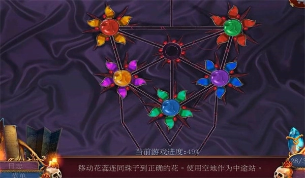 1、玩家需将花蕊移动到对应颜色的珠子上,具体移动方向为:绿色向上、向右移,蓝色向下移,紫色向右移,黄色向下移,即可解开谜题。