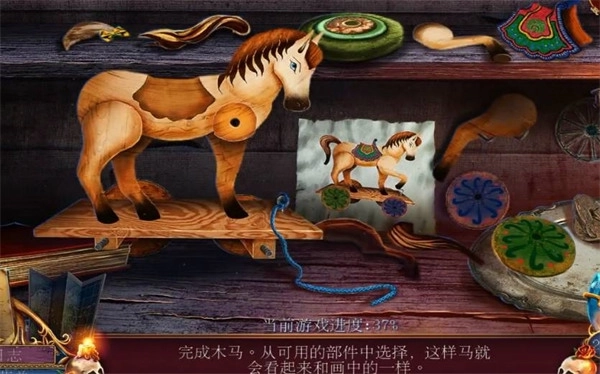 3、最后一个谜题是拼装木马,玩家需按照图示来组装:把四个轮子安装在木板的四周,将坐垫放置到马背上,再把蓝色绳子系在马脖子上,这样就完成拼装了。