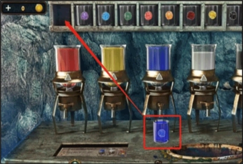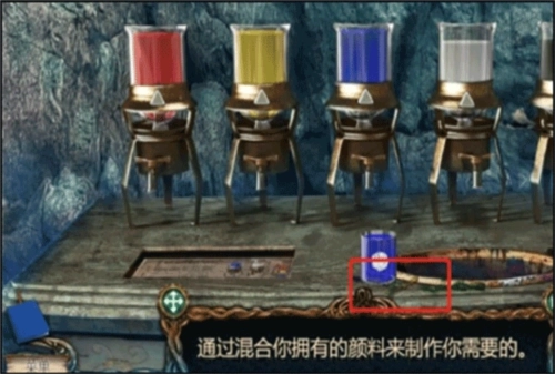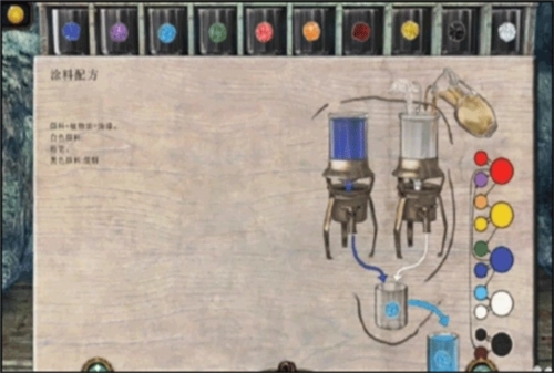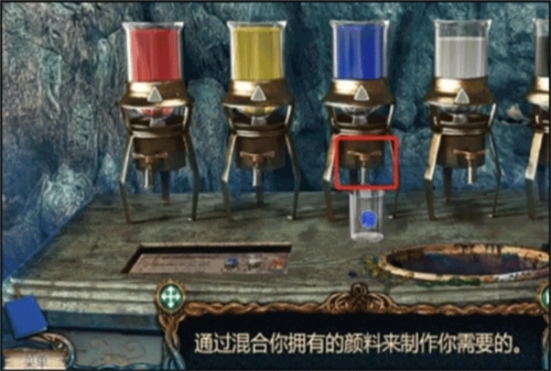 5、第一个烧瓶是蓝色,因为蓝色本来就有了,所以只需要在蓝色的颜料瓶下面旋动两次按钮就可以了。配好色后,将烧瓶移回去,然后再换一个烧瓶。