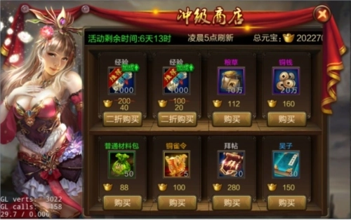在创建角色后的前7天里,每天都会解锁一个冲级专属商店。在这个商店中,玩家不仅能购买到铜钱、粮草等各类游戏资源,还能以极低的价格获取2份经验值。