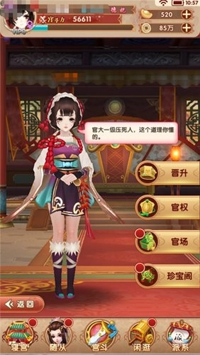 12、当小主的官品达到从七品后,便会正式卷入后宫的纷争之中,届时官权、官场、珍宝阁这三项功能将对玩家开放。