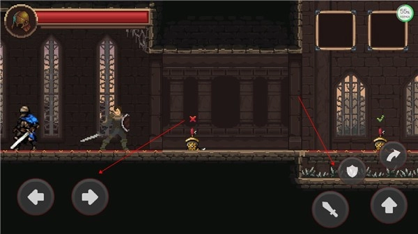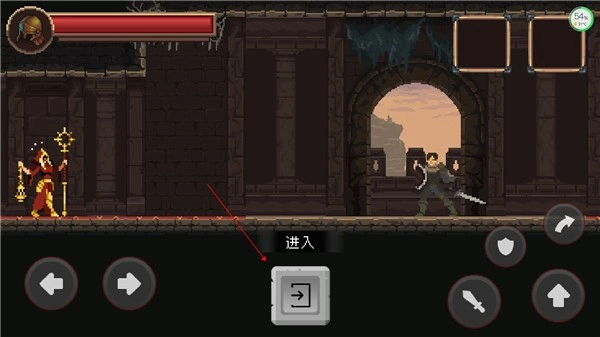 左边控制方向,右边分为攻击、防御、跳跃、滚动。
