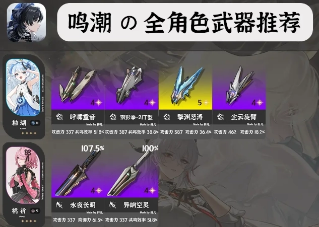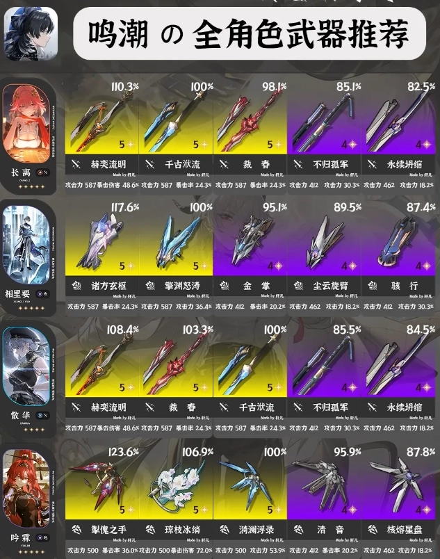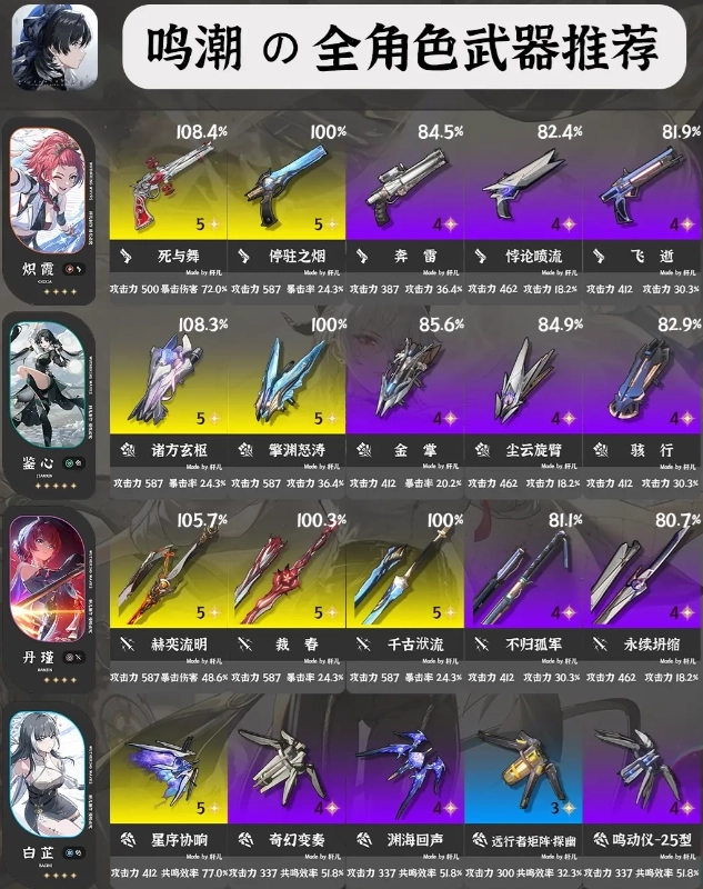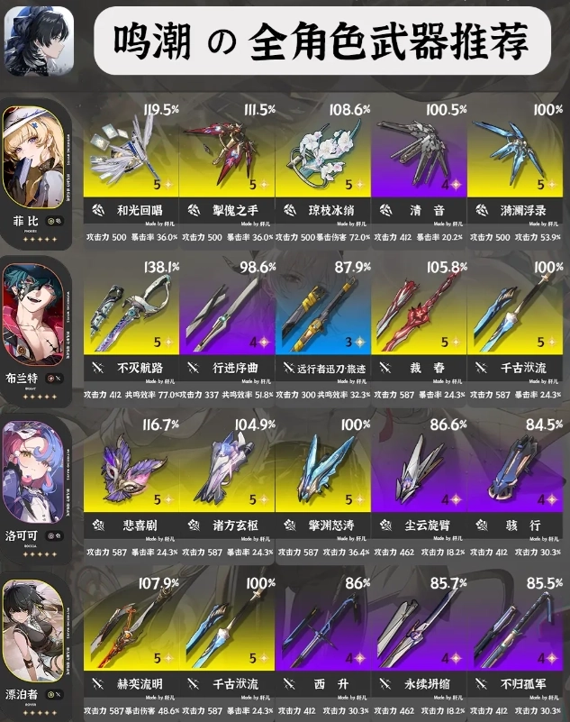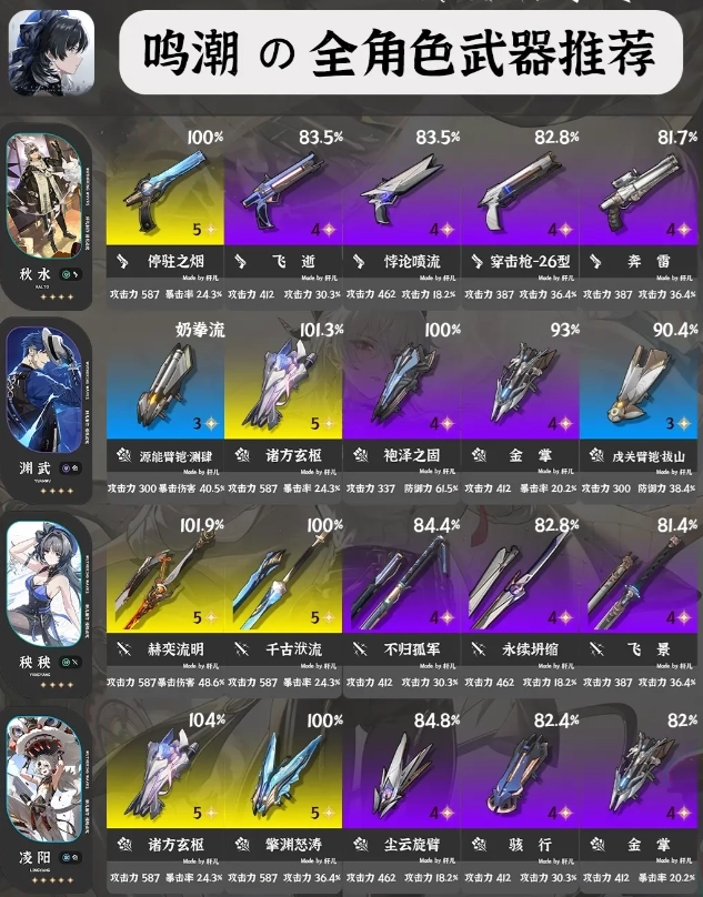 ①每位角色推荐5把武器,按照优先级排序