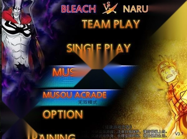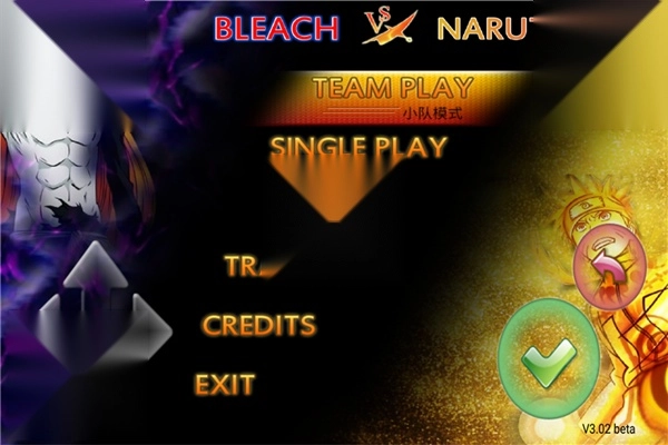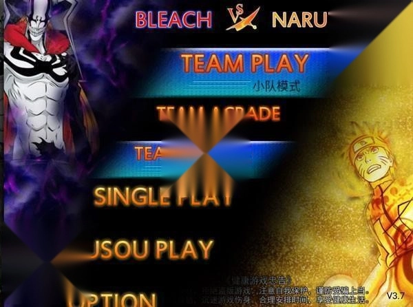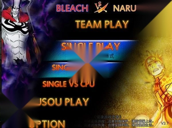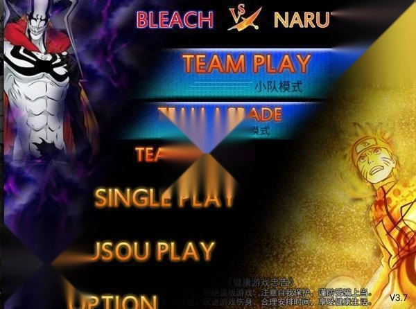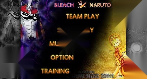 1. 开启《死神vs火影》游戏,进入玩法选择界面,其中包含小队模式(TEAM PLAY)、单人模式(SINGLE PLAY)、无双模式(MUSOU PLAY)。