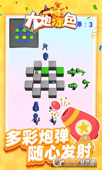 大炮涂色游戏关卡非常多,每一关都是精心设计,游戏采用精致的3D画面,玩家需要通过射击将炮弹击中相应的砖块,全新的炮弹涂色的玩法,节奏感非常的快。