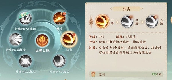 2技能:狂击,攻击单个目标,临时提升物理攻击,数值为自身等级乘以1.5。(技能达到2阶时,伤害结果增加10%;达到3阶时,伤害结果再增加10%)