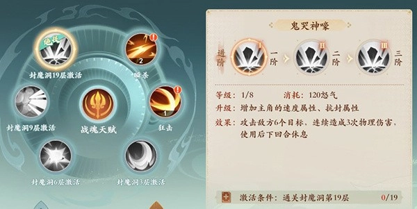 6技能:鬼哭狼嚎(怒气技能,消耗120点怒气):对群体6个目标发动攻击,连续造成3次物理伤害,之后休息一回合。(2阶效果:副目标将优先选择气血较少的单位;3阶效果:攻击目标数量增加1个)