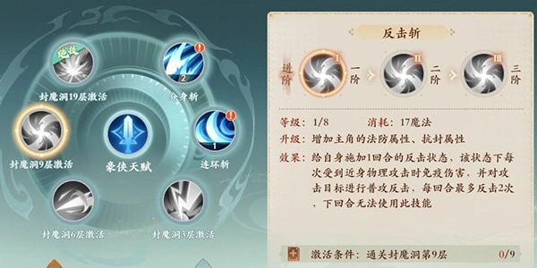 5技能:反击斩,可施加1回合的反击状态。在此状态下,每次遭受近身物理攻击时,会免疫该次伤害,并以普通攻击进行反击,每回合最多反击2次,该技能冷却时间为2回合。(2阶效果:反击次数增加1次;3阶效果:技能造成的伤害结果额外提升10%)