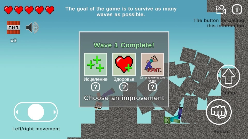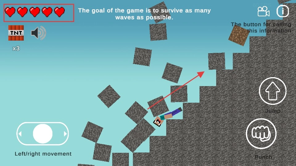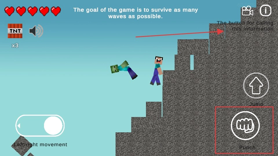 1、先熟悉游戏的操作界面,左侧的按钮是用来控制角色移动的,右侧的两个按钮分别对应跳跃和攻击功能,要清楚游戏的核心目标是让角色在尽可能多的波次攻击中存活下来。