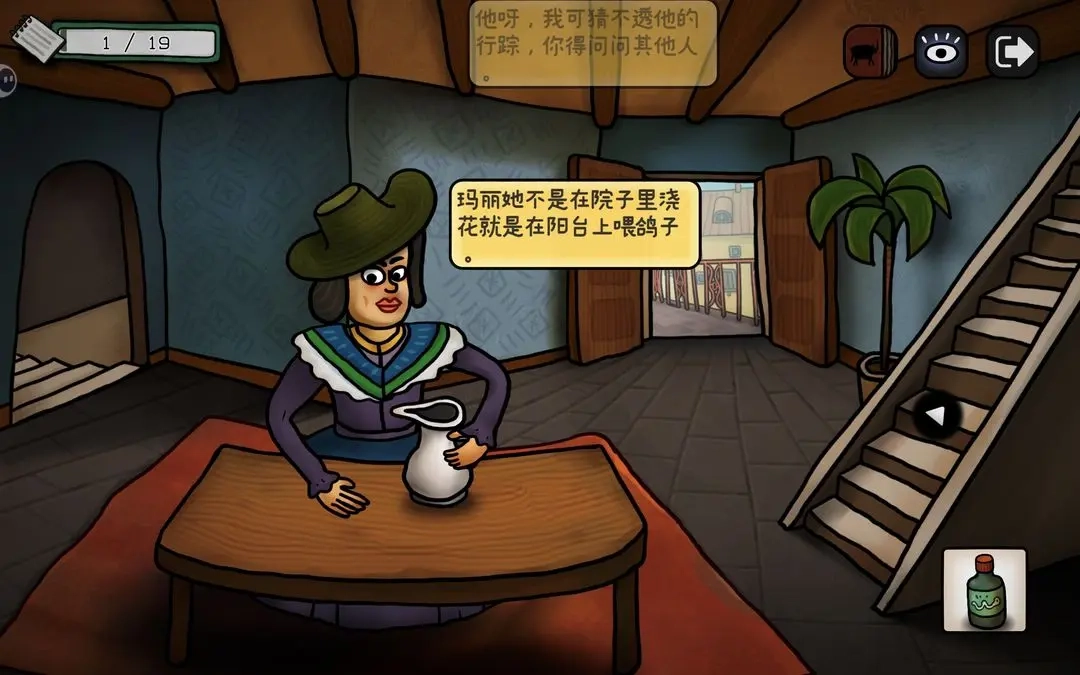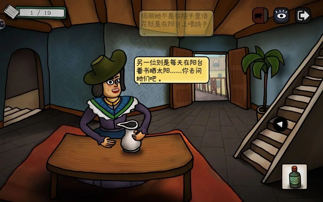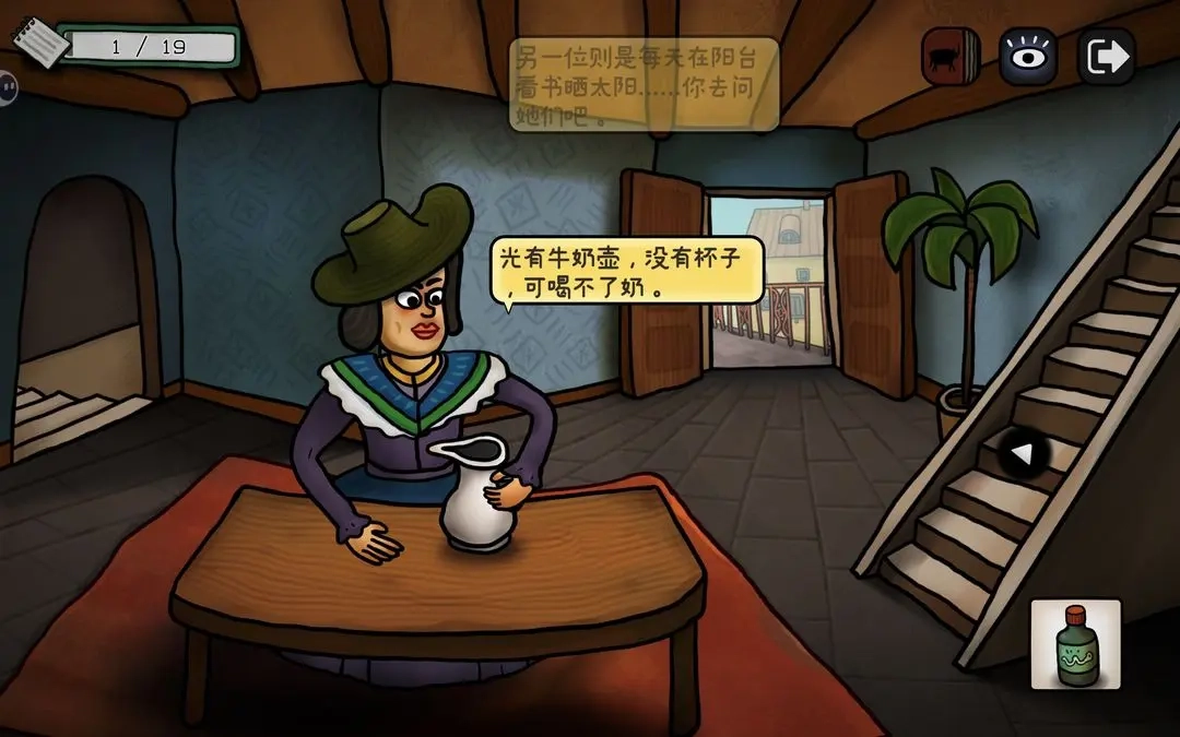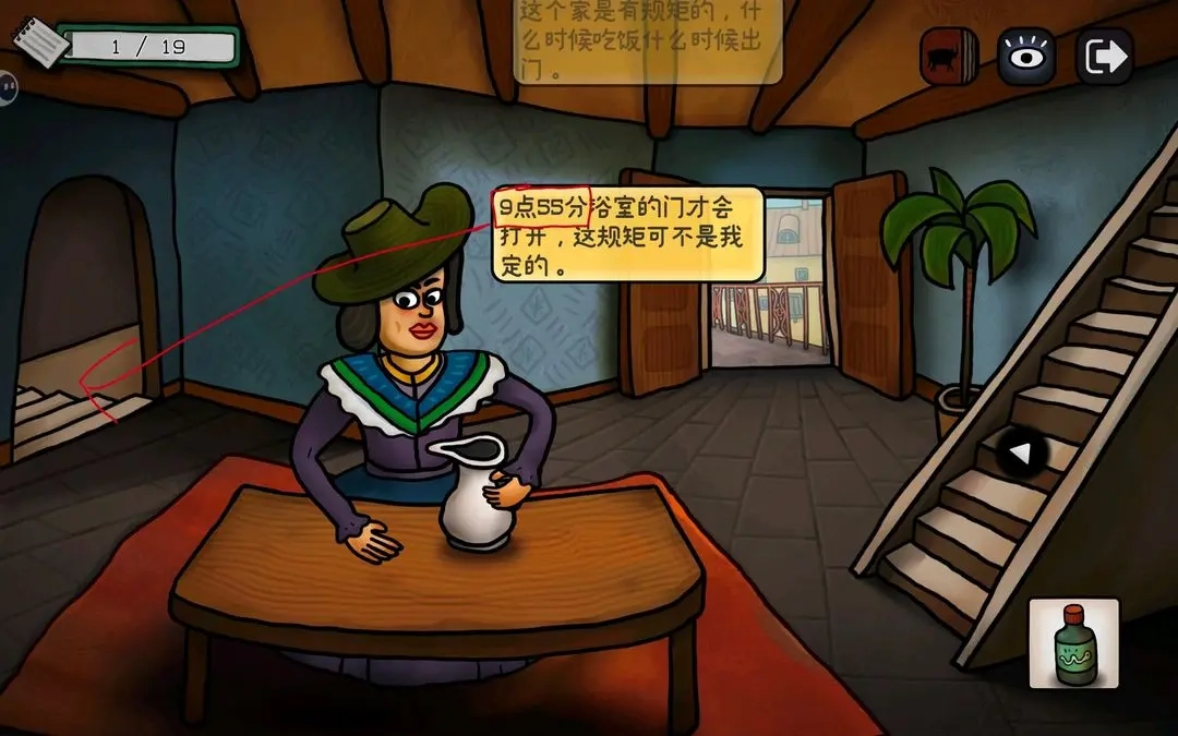 和女人交谈后,得到了一些提示:浴室门会在9点55分开;阳台上的鸽子需要喂食;还有一个女孩正在阳台看书;另外,这位女人还需要一个杯子。