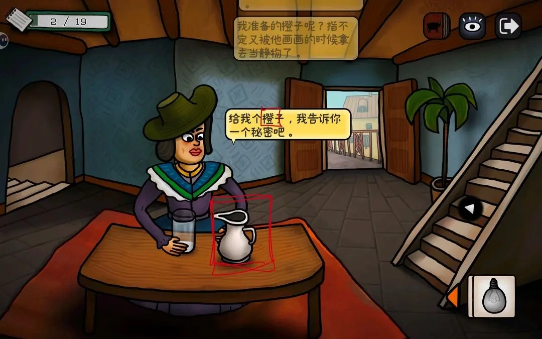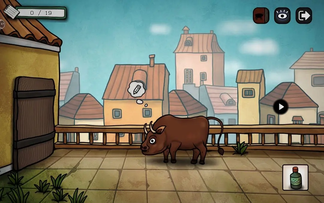 按下左键,看到阳台上的公牛后,将画笔递给它,此时会出现铅笔样式的气泡框。
