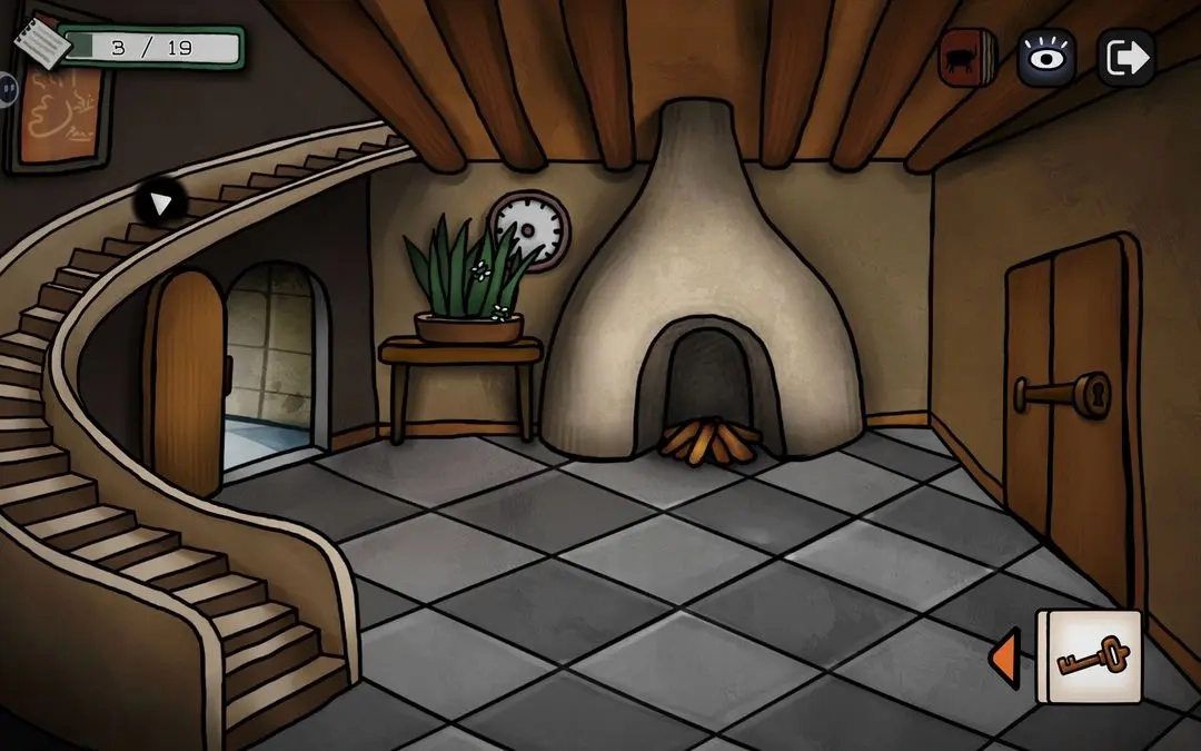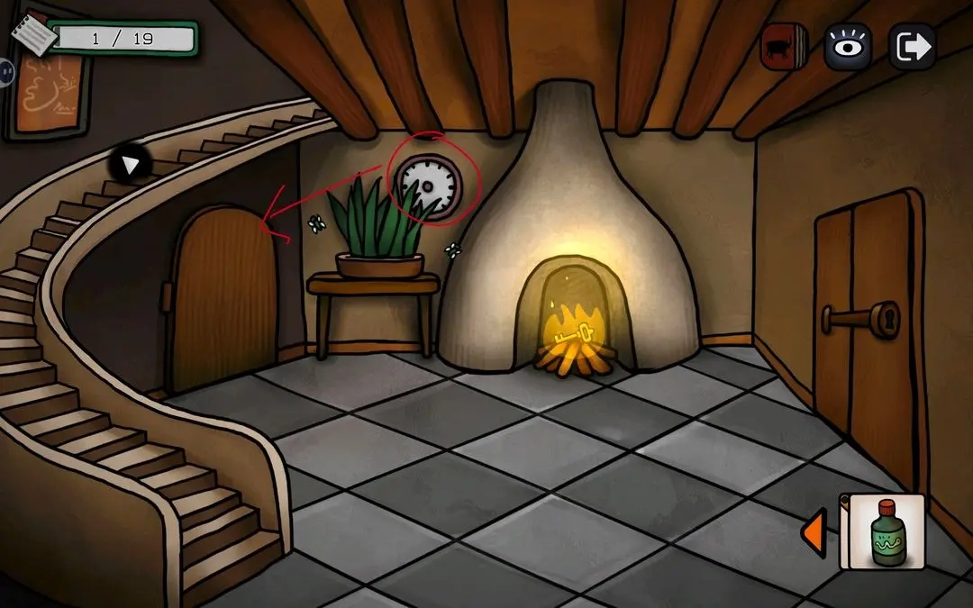 取走空的牛奶壶,把壁炉的火熄灭,拿上钥匙,接着用钥匙打开右侧的锁