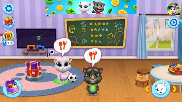 2、汤姆猫总动员》的人物形象可爱Q萌,每一个角色都有着非常讨喜的造型,游戏玩法简单易上手,玩家需要细心照顾每一位汤姆猫家族成员,陪他们游戏娱乐,还能购买玩具和汤姆们互动玩耍。