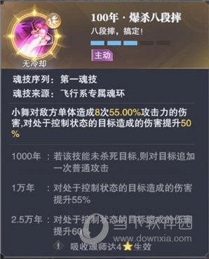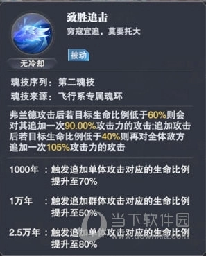 该技能虽为单体攻击,但会依据目标的血量情况触发被动效果,进而发起单体或群体追击;后续随着魂环年份的提升,触发这一效果的条件也会相应降低。